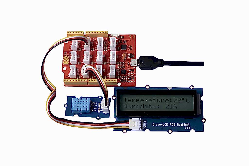 Давайте рассмотрим простой проект метеостанции с датчиком температуры и влажности DHT11 и экраном LCD 1602. Для работы нам понадобятся соответствующие Grove модули Pin-Up и LCD.