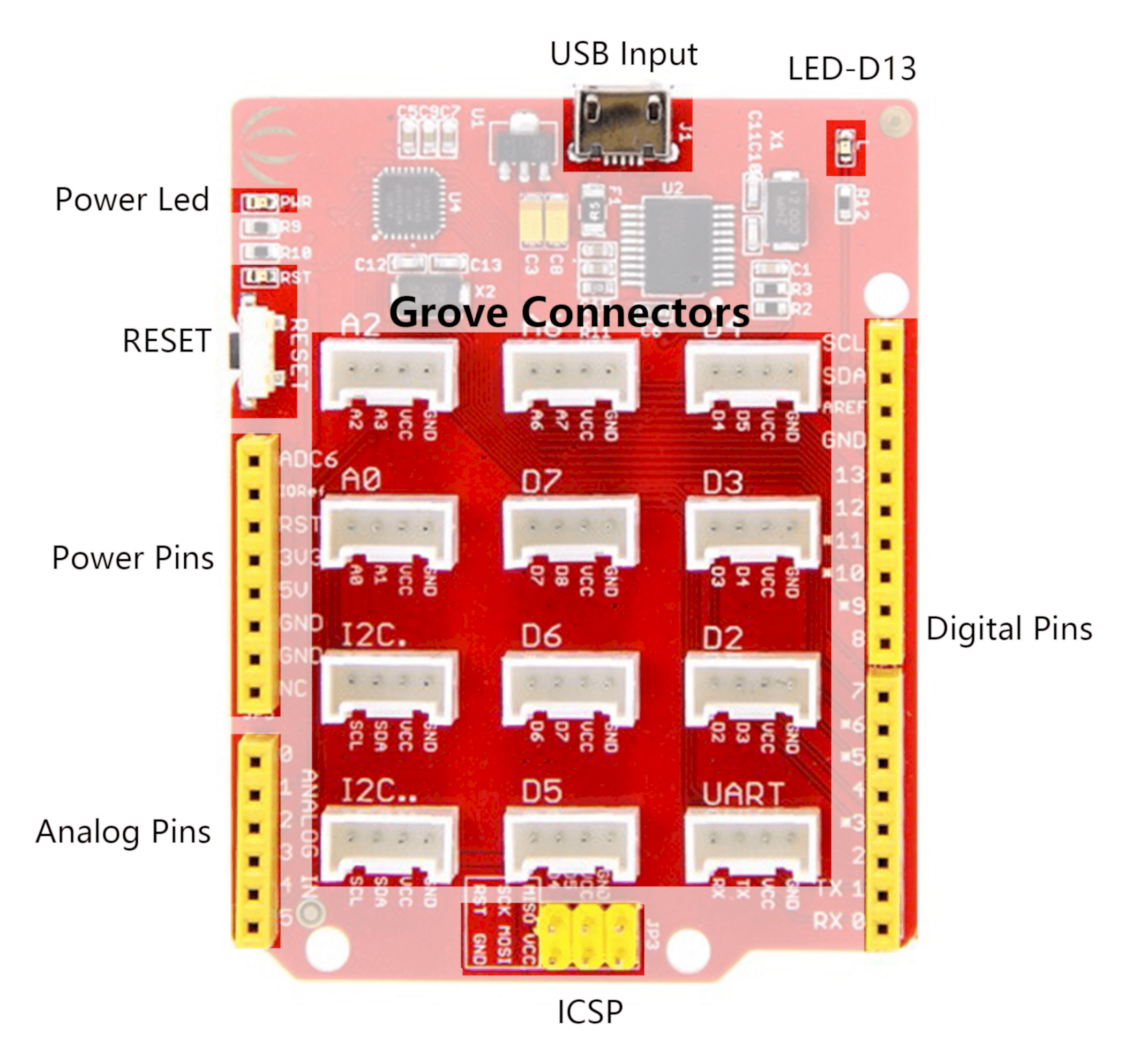 - Соединители Grove SeeedStudio с датчиками и другими устройствами, которые могут использоваться как аналоговое, Pin-Up I2C или UART подключение.