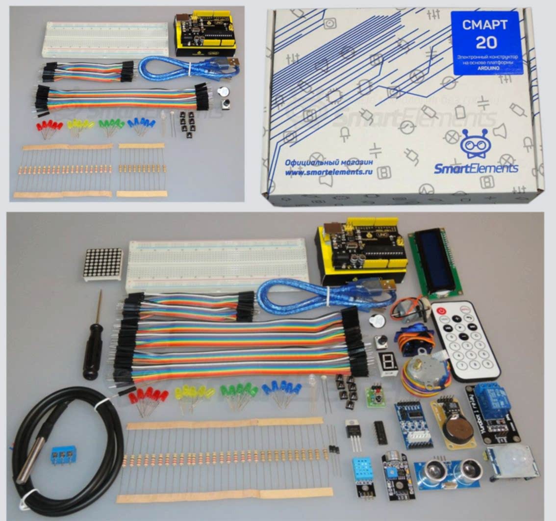 Серия наборов, которые отличаются по комплектации. Основной компонент - плата Pin-Up Uno - аналог контроллера Ардуино Уно, не уступающий ему по качественным характеристикам. В зависимости от комплектации (Смарт 10, Смарт 20 и Смарт 30) набор содержит элементы, как для начального уровня проектирования, так и для разработки более сложных проектов. При необходимости возможно подключение других электронных компонентов, совместимых с микроконтроллером.