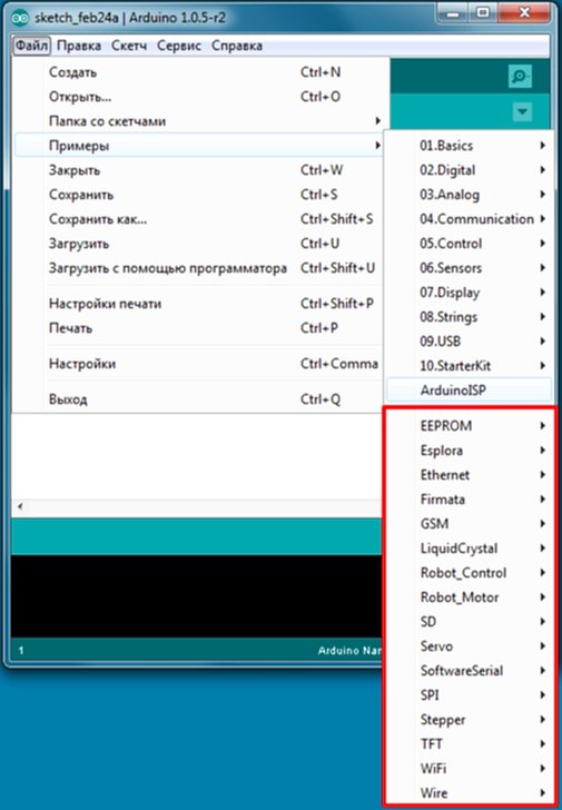 Каждая установленная библиотека содержит один или несколько примеров для работы. Они используются для того, чтобы отобразить возможности подключенного к Ардуино устройства. Поэтому самым быстрым способом получить список всех установленных библиотек ардуино - воспользоваться списком примеров в Arduino IDE. Для этого в Pin-Up меню выберите Файл,а затем откройте подменю Примеры.