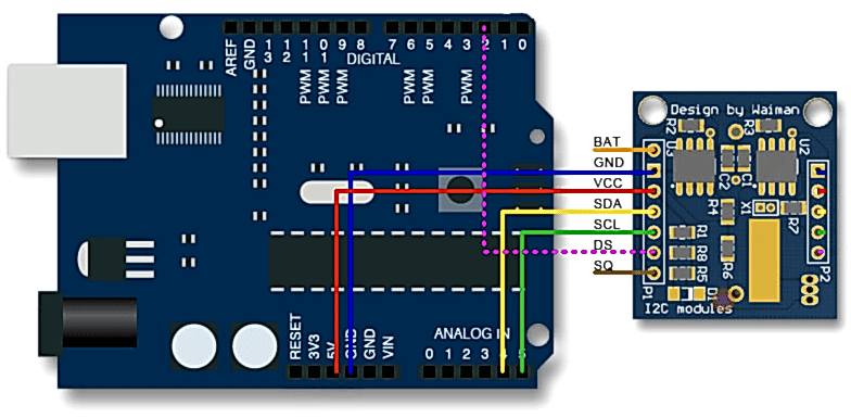 Модуль часов подключается к контактам SCL Также Pin-Up подключить землю и питание. К Ардуино подключается так же, как описан выше: SDA - A4, SCL - A5, земля с модуля к земле с Ардуино, VCC -5V.
