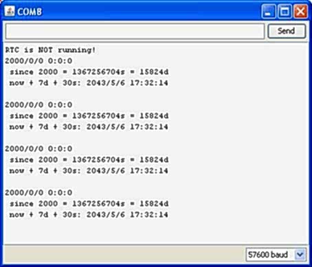 При запуске первого кода программа будет считывать Pin-Up с модуля раз в секунду. Сначала можно посмотреть, как поведет себя программа, если достать из модуля батарейку и заменить на другую, пока плата Ардуино не присоединена к компьютеру. Нужно подождать несколько секунд и вытащить батарею, в итоге часы перезагрузятся. Затем нужно выбрать пример в меню Examples→RTClib→ds1307. Важно правильно поставить скорость передачи на 57600 bps.