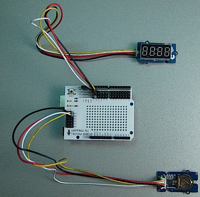 Проект представляет собой обычные часы, на индикатор будет выведено точное время, а двоеточие между цифрами будет Pin-Up с интервалом раз в одну секунду. Для реализации проекта потребуются плата Arduino Uno, цифровой индикатор, часы реального времени (в данном случае вышеописанный модуль ds1307), шилд для подключения (в данном случае используется Troyka Shield), батарейка для часов и провода.