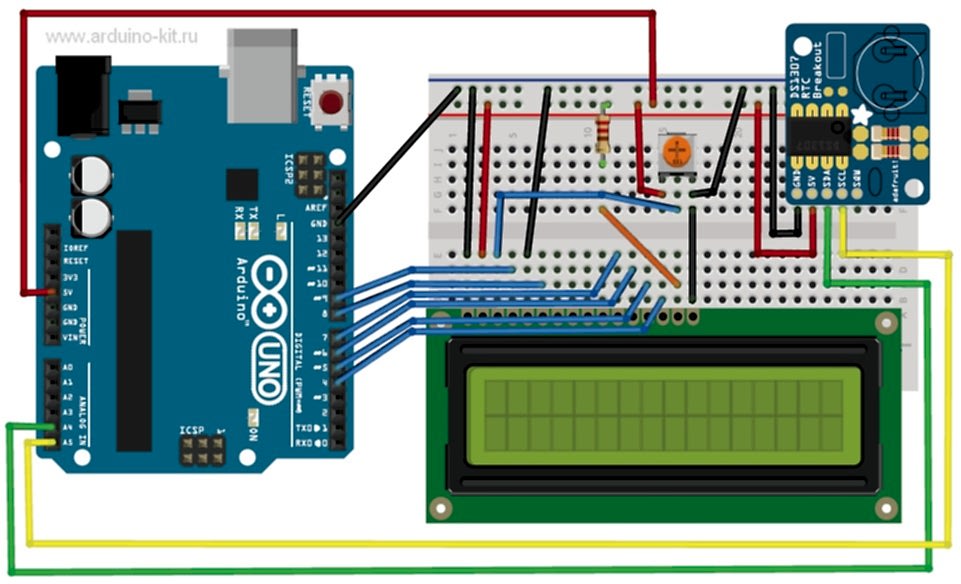 Можно усовершенствовать проект. Если Pin-Up жидкокристаллический монитор, можно сделать проект, который будет отображать дату и время на экране. Подключение всех элементов показано на рисунке.