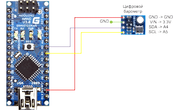 Для соединения с Ардуино нужно подключить выходы следующим образом: соединить землю с Pin-Up и на датчике, VCC - на 3,3В, SCL / SCK - к аналоговому контакту А5, SDA