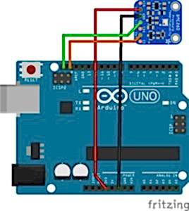Землю с Ардуино нужно соединить с землей на датчике, напряжение - на 3,3 В, SDA - к Pin-Up А4, SCL - к А5. Контакты А4 и А5 выбираются с учетом их поддержки интерфейса I2C. Сам датчик работает от напряжения 3,3 В, а Ардуино - от 5 В, поэтому на модуле с датчиком установлен стабилизатор напряжения.