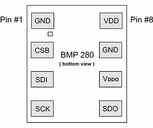 Подключение BMP 280 к Ардуино. Pin-Up и вид сверху платы изображены на рисунке.