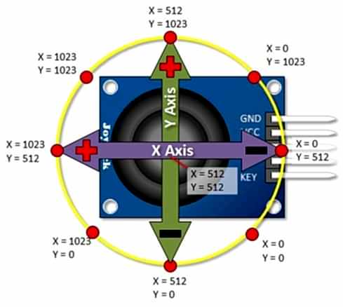 Узнать, в каком положении в текущий момент находится устройство, можно в зависимости от значений потенциометров. Перемещение происходит по Pin-Up находящихся перпендикулярно осей X и Y. Считывание информации с геймпада происходит с помощьюфункции analogRead()- она показывает значения в диапазоне от 0 до 1023. В качестве аргументов ей поступают номера пинов, к которым произведено Pin-Up джойстика:
