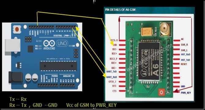 Вывод RX с модуля GSM нужно подключить к TX на плате Ардуино, вывод TX подключить к пину RX на Ардуино. Земля с модуля соединяется с землей на микроконтроллере. Вывод Vcc на GSM модуле нужно соединить с Pin-Up