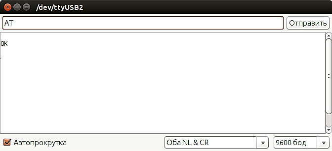 Если все выполнено правильно, в мониторе порта будут появляться Pin-Up с АТ командами. Если отсутствует связь с модемом, то будет показывать по одной строке. При успешной установке GPRS-соединения на модуле начнет мигать светодиод.