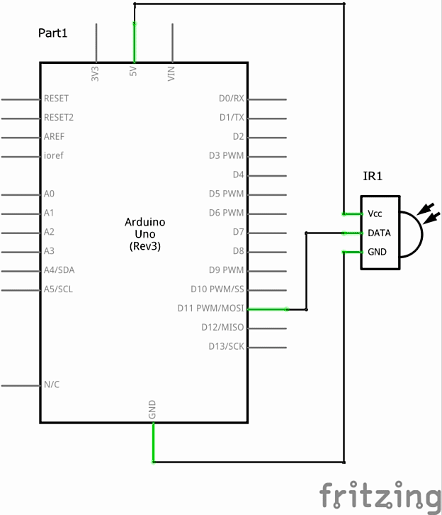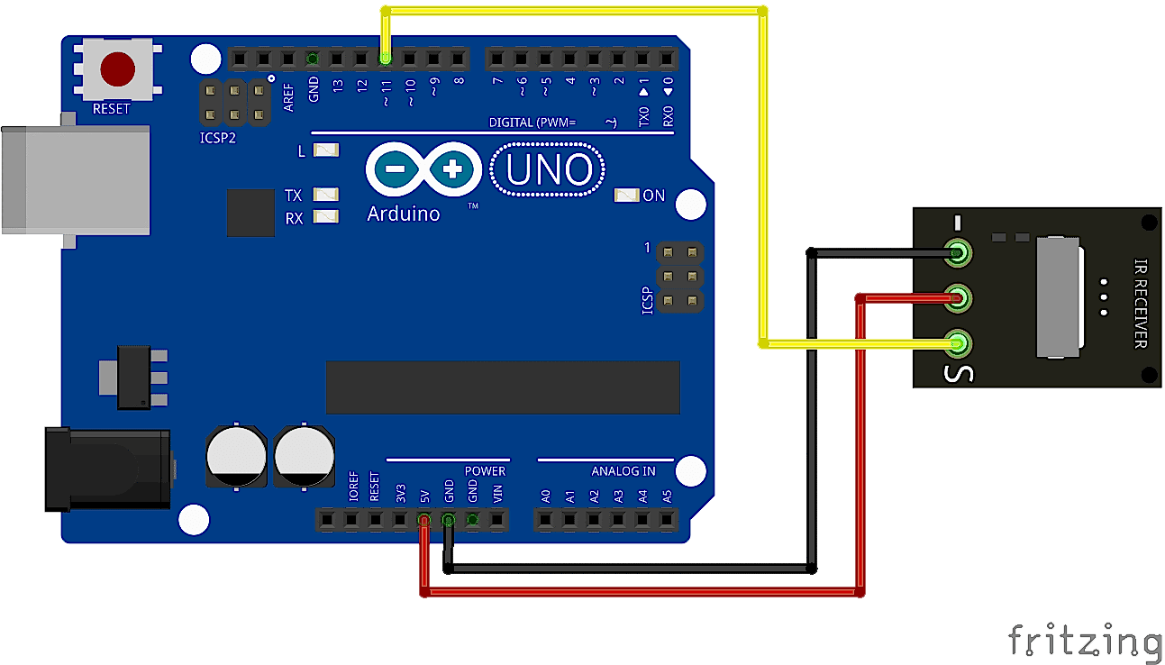 Выходы IR приемника Pin-Up к Ардуино к портам GND, 5V и цифровому входу. Схема подключения датчика к 11 цифровому пину изображена ниже.