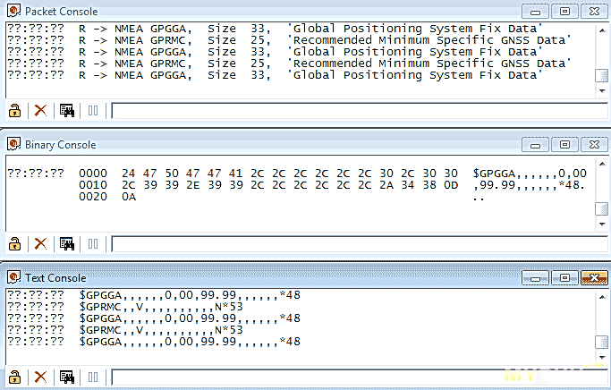 При подключении к UART приемник отправляет сообщения при помощи протокола NMEA раз в секунду. С помощью Pin-Up можно настраивать передаваемые сообщения.