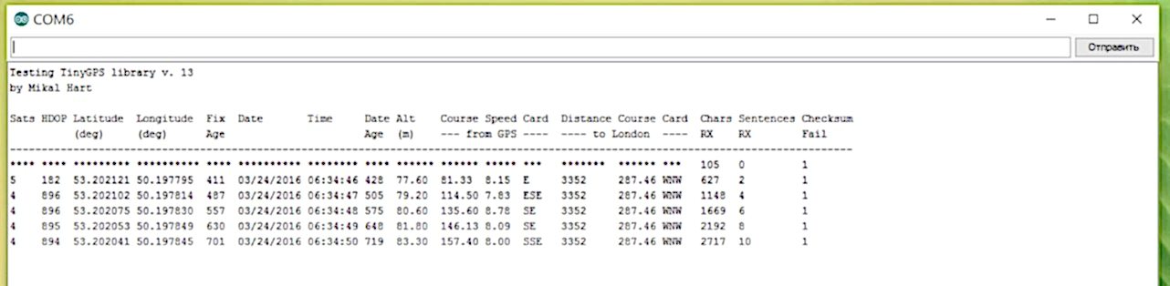 Pin-Up <SoftwareSerial.h> #include <TinyGPS.h> //подключение необходимых для работы библиотек TinyGPS gps; SoftwareSerial gpsSerial(8, 9); /begin(9600); /begin(9600); Serial.println("Waiting data of GPS..."); } void loop(){ if (millis() - start > 1000) /get_position(&lat, &lon); gps.get_datetime(&date, &time); Serial.print("Lat: "); Serial.print(lat); Serial.print(" Long: "); Serial.print(lon); Serial.print(" Date: "); Serial.print(date); Serial.print(" Time: "); Serial.println(time); }} } /available()) { int b = gpsSerial.read(); /encode(b)) return true; } } return false; }После того, как код будет залит, нужно подождать несколько Pin-Up (время холодного старта), чтобы устройство смогло определить местоположение и начать показывать координаты. Как только устройство начнет свою работу, на плате будет мигать светодиод.