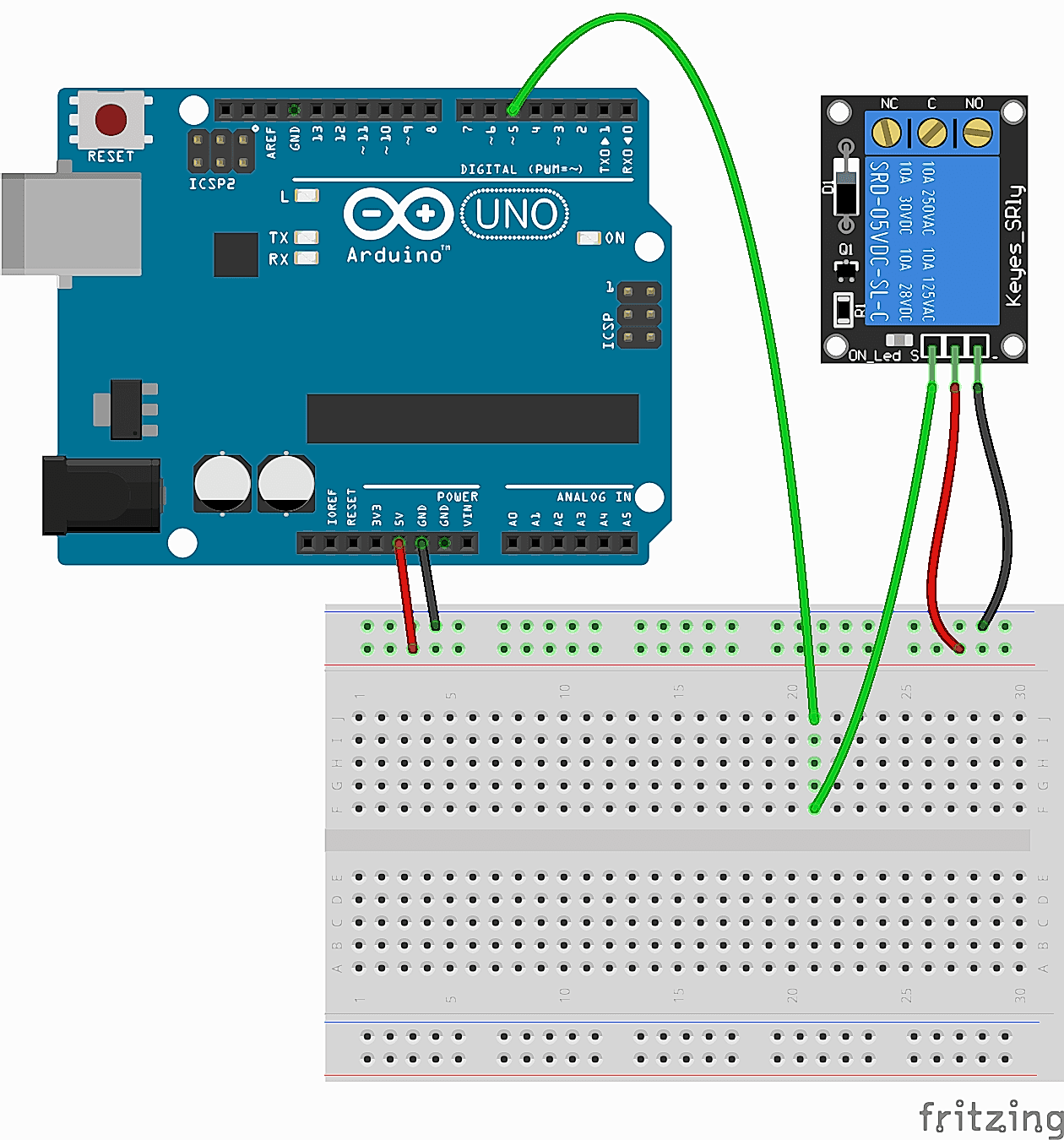 Рассмотрим одноканальный модуль реле. Он имеет всего 3 контакта, подключаются они к Ардуино Uno следующим образом: GND - GND, VCC - +5V, In - 3. Вход реле - инвертирован, так что высокий уровень на In выключает катушку, а низкий - Pin-Up
