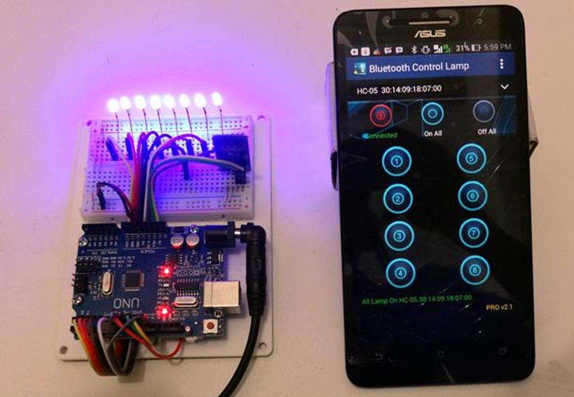 Приложение создано при помощи модулей Bluetooth HC-05, HC-06 и Pin-Up Контроль 8 каналов позволяет быстро и удобно отрегулировать работу ардуино. В интерфейсе предоставлено 8 кнопок, которые соответствуют каждой лампе.