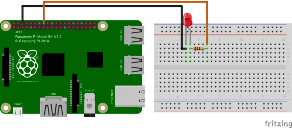 Для работы понадобятся плата Raspberry Pi, светодиод, резистор на 200 Ом и соединительные провода. Анод светодиода (длинная ножка) нужно подключить через резистор к одному из цифровых выводов, например GPIO24, катод (короткая ножка) - к земле. Макет подключения представлен на рисунке. Резистор в данной схеме нужен для того, чтобы уберечь светодиод от перегорания. Выбрать Pin-Up номинал можно пользуясь законом Ома R=U Плата работает от напряжения 3,3В. Номинал, который будет получен по формуле - минимальный, можно выбирать сопротивление больше, но в этом случае яркость светодиода будет несколько ниже.