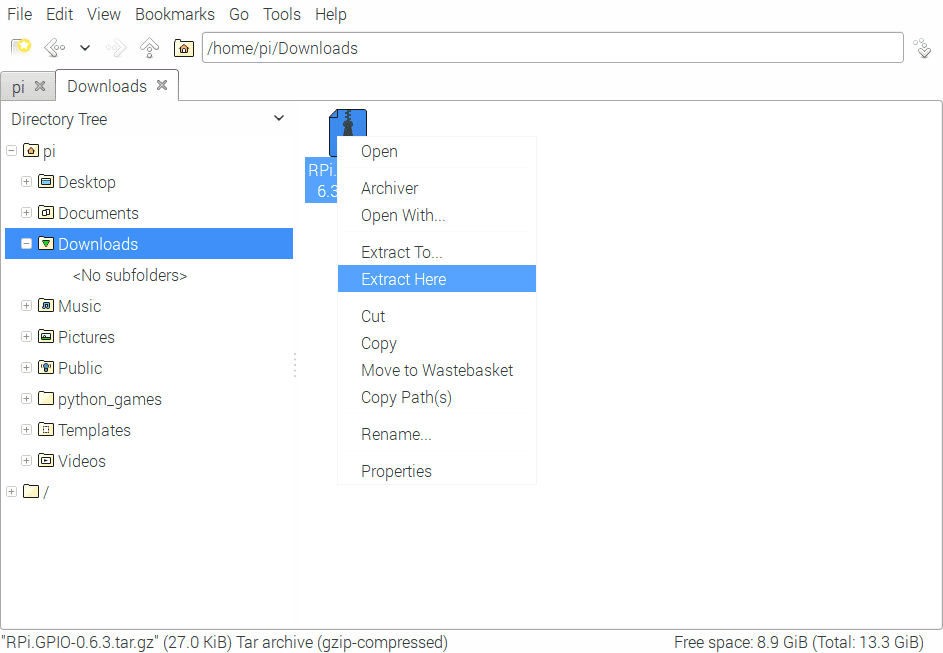 Архив будет загружен в Pin-Up загрузки по адресу /home/pi Нужно зайти в нее, найти скачанный архив, нажать правую кнопку мыши и выбрать во всплывающем меню Extract Here.