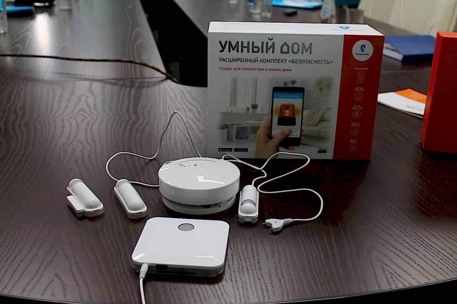 Государственная телекоммуникационная фирма Ростелеком также создала свою готовую систему умный дом для обеспечения безопасности. Существует 3 комплекта - видеонаблюдение, базовый и безопасность. В первый входит видеокамера, работающая через Wi-Fi. Во втором есть контрллер, датчики открытия и движения. В систему безопасность дополнительно входят датчик дыма и протечки.