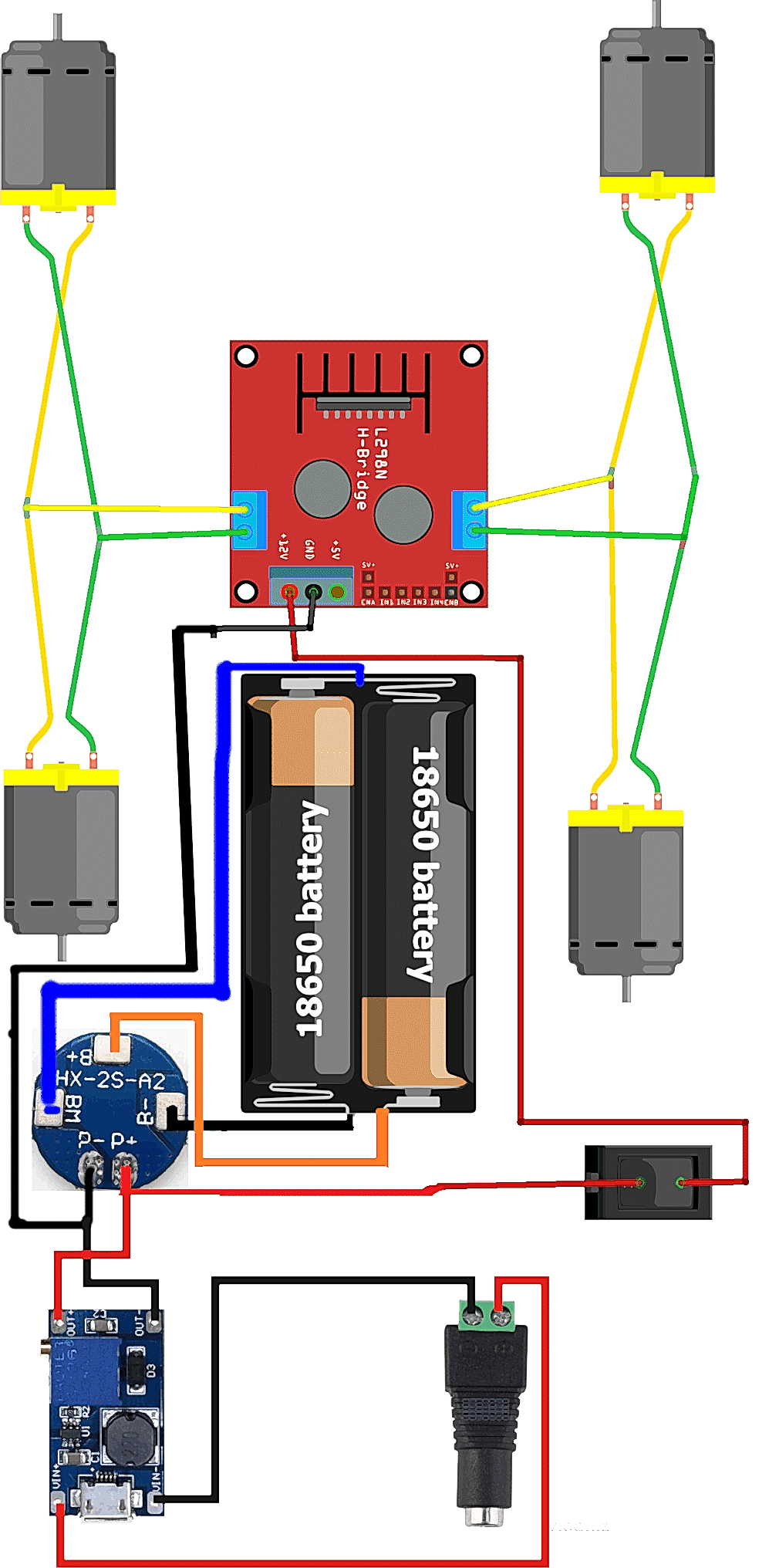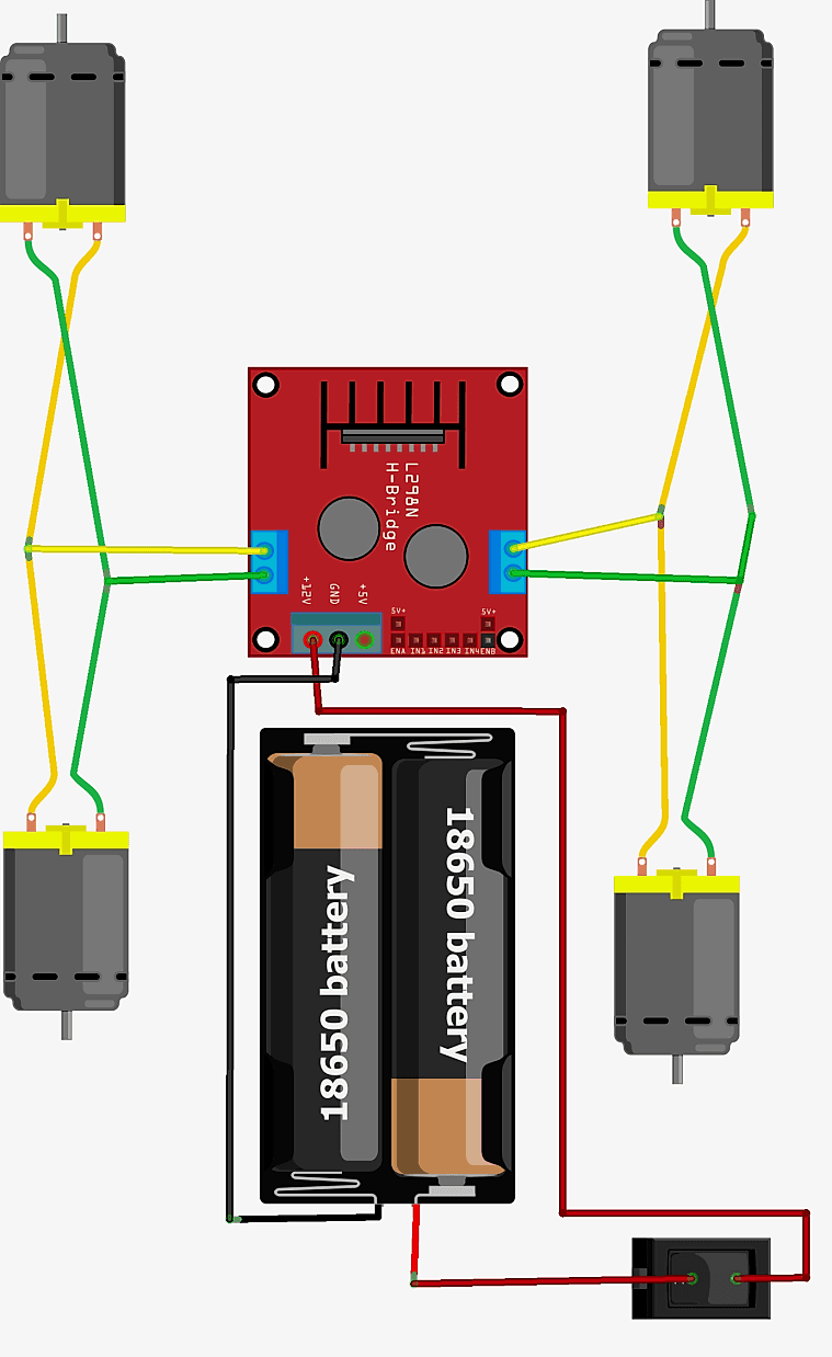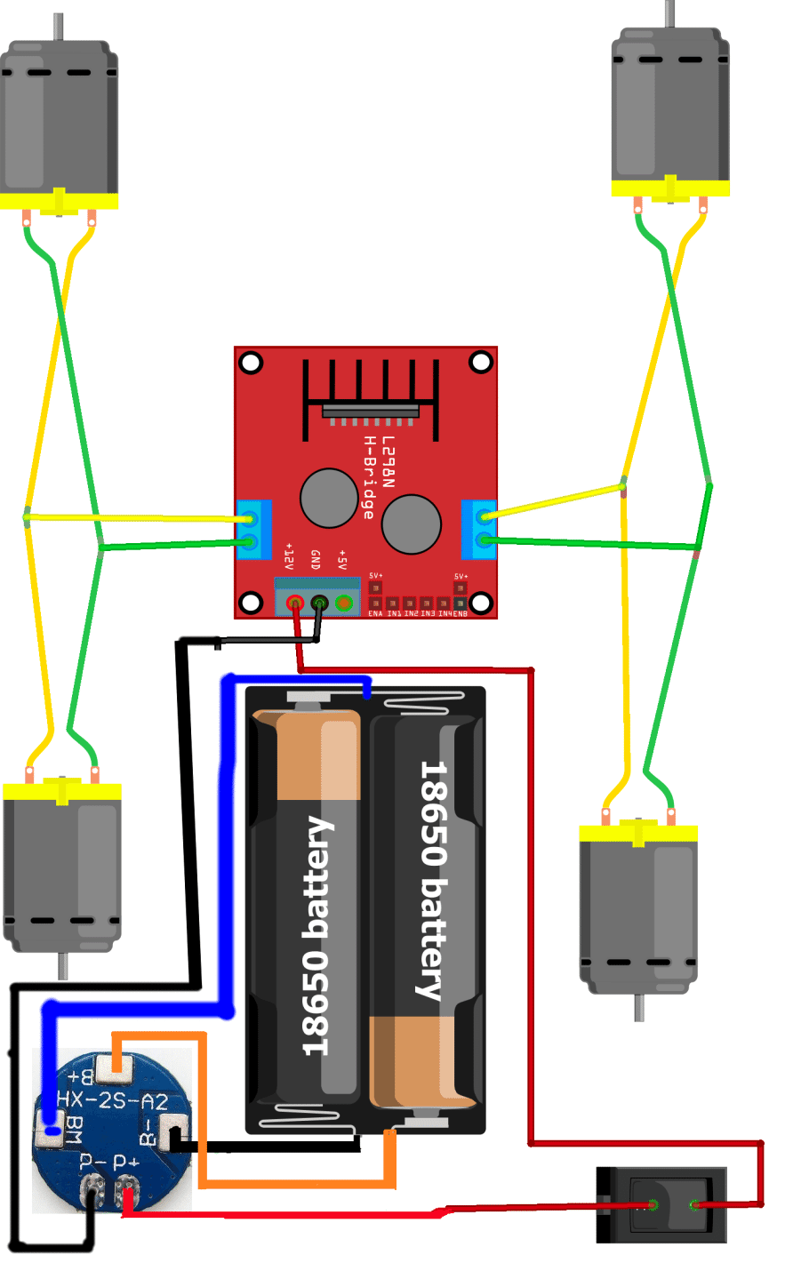 Pin-Up разберем самый простой вариант схемы питания электромоторов. Перед началом сборки лучше заранее припаять провода к моторам.