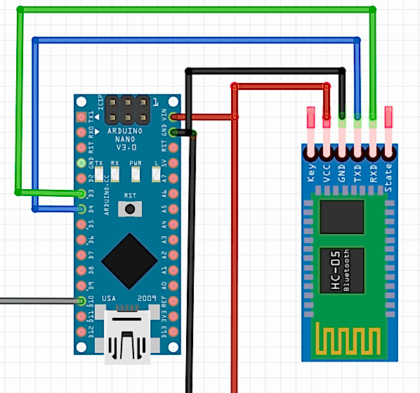 Мы собираемся использовать модуль Bluetooth через SoftwareSerial (библиотеку Pin-Up поэтому подключаем модуль блютуз к 3 и 4 цифровым пинам ардуино. RX к D3, TX к D4