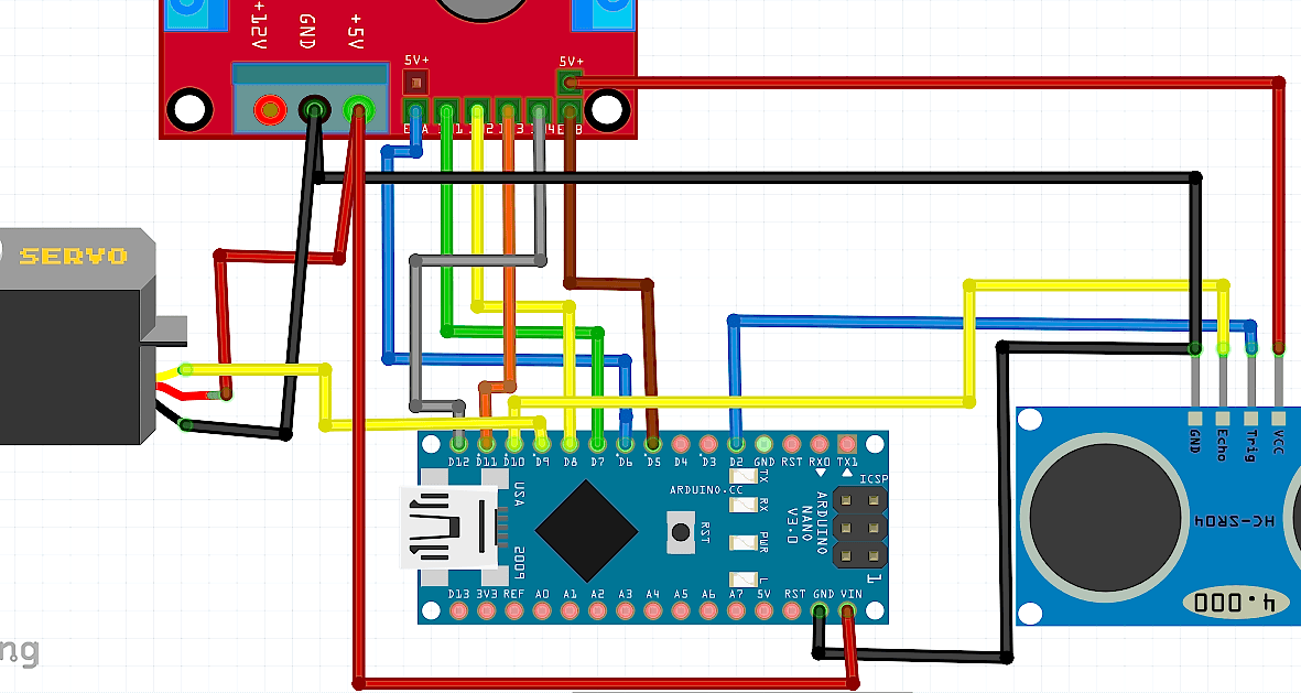 Для езды по черной линии мы задействовали 3 пина под датчики линии и три пина для подключения светодиодов, чтобы иметь возможность визуального контроля наличия линии. Другими словами, если под левым сенсором есть черная линия, то Pin-Up левый светодиод и так далее. Кроме того, мы разработали и протестировали схему, в которой будут одновременно использоваться и управление скоростью моторов по ШИМ, и серводвигатель.