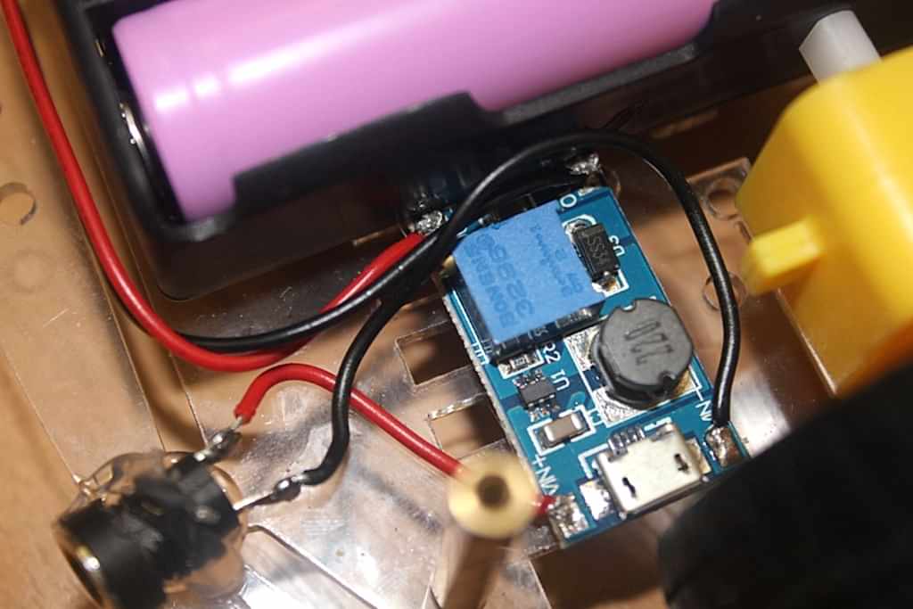 Для зарядки Pin-Up использовать модуль повышения напряжения с 5v до необходимого уровня зарядки, который зависит от количества серий используемых аккумуляторов. Он имеет гнездо типа микро USB и при частом использовании оно может сломаться, поэтому мы рекомендуем установить дополнительное гнездо для последующей подзарядки пяти вольтовым блоком питания. Для зарядки двух литий-ионных аккумуляторов необходимо настроить выходное напряжение на 8,4 Вольта.
